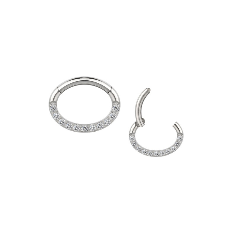 Anneau ovale en titane ASTM F136 grade 23, avec brillants blancs sur la face avant du contour. Strass griffés.