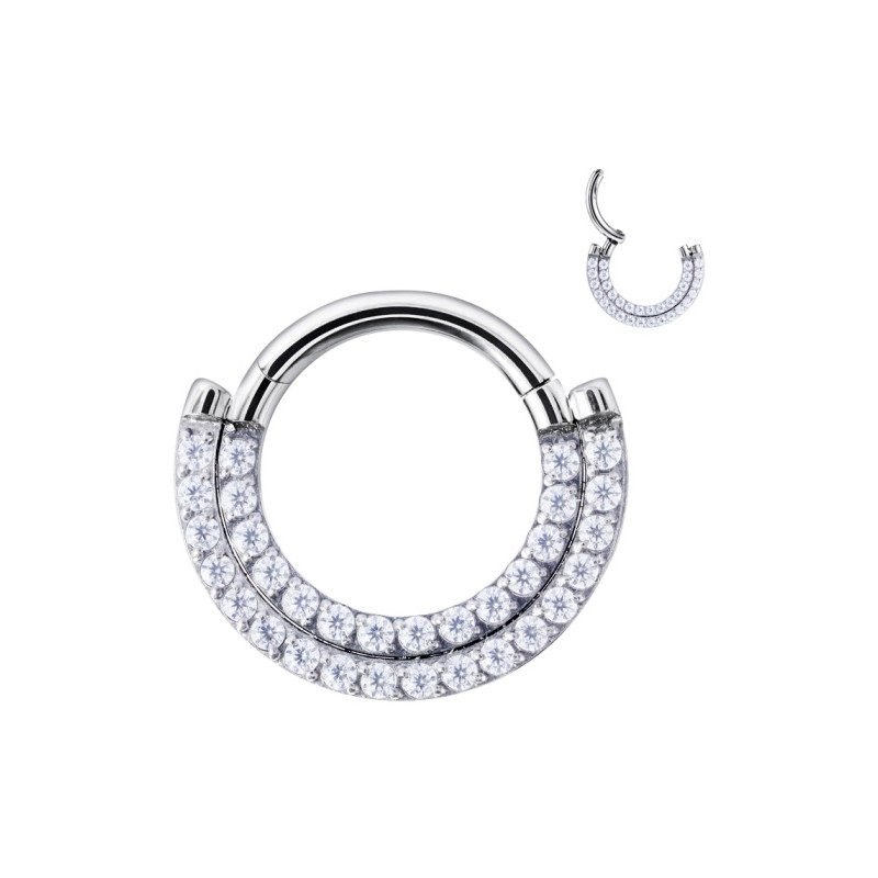 Anneau en titane ASTM F136 grade 23, avec 2 rangées de brillants blancs sur la face avant du contour. Strass griffés.