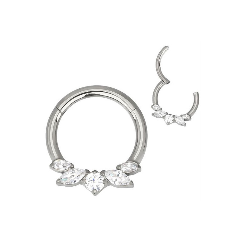 Anneau en titane ASTM F136 grade 23, avec motif macquise 5 brillants blancs sur la face avant du contour. Strass griffés.