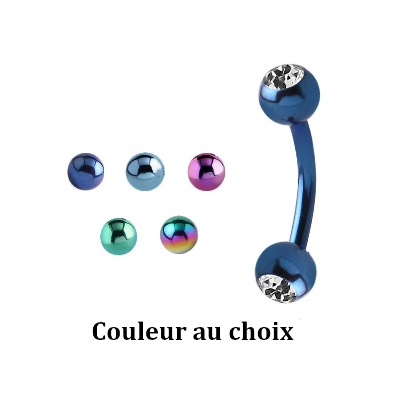 Bijou de piercing en titane G23 anodisé coloré avec une tige courbée et 2 boules avec brillant blanc à visser.