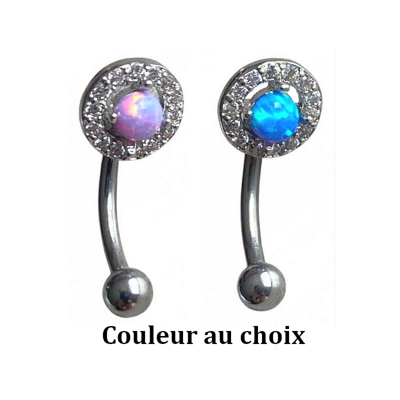 Bijou de piercing en acier chirurgical avec 1 opale synthétique sertie au centre et 14 strass blancs sertis autour, une tige courbée et une boule. Taille 6 mm.