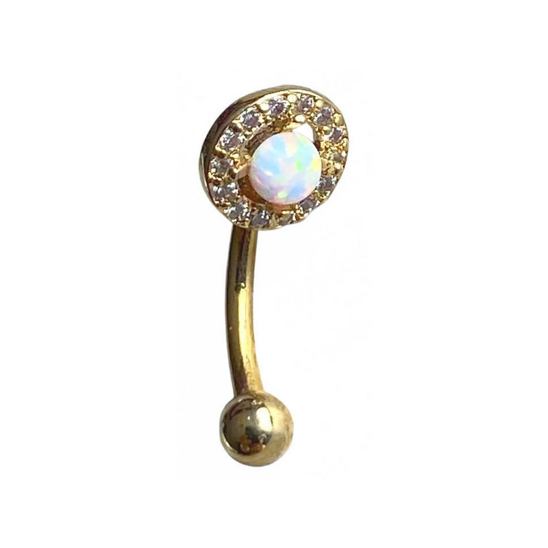 Bijou de piercing en acier chirurgical doré avec 1 opale synthétique sertie au centre et 14 strass blancs sertis autour, une tige courbée et une boule. Taille 6 mm.