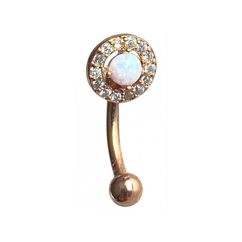 Bijou de piercing en acier chirurgical or rose avec 1 opale synthétique sertie au centre et 14 strass blancs sertis autour, une tige courbée et une boule. Taille 6 mm.