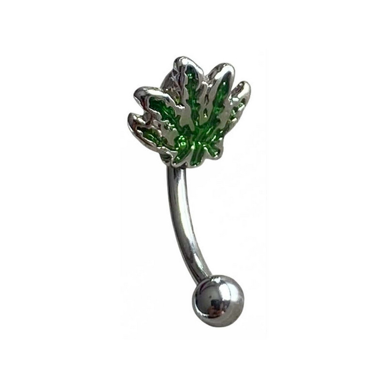 Bijou de piercing en acier chirurgical motif feuille verte, une tige courbée et une boule. Taille motif : H 7 mm x L 8 mm.