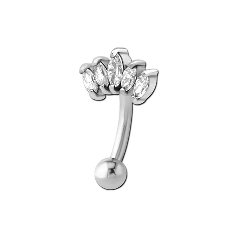 Bijou de piercing en acier chirurgical avec motif marquise 5 brillants blanc verticaux, une tige courbée et une boule.
