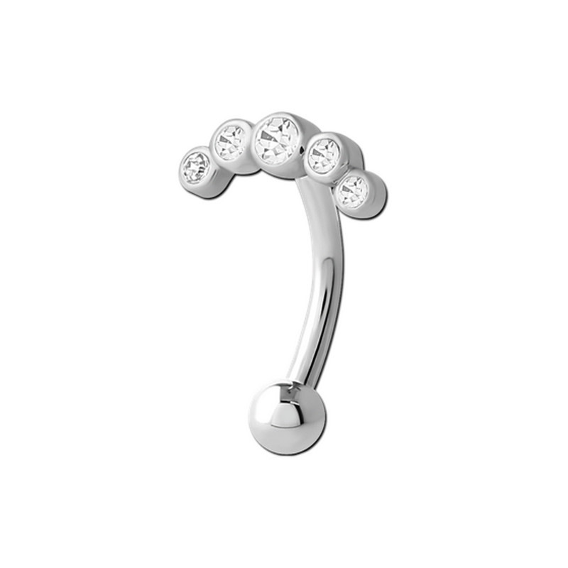 Bijou de piercing en acier chirurgical avec motif marquise 5 brillants blancs ronds en long, une tige courbée et une boule.
