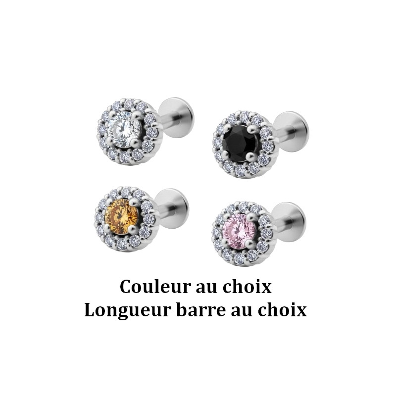 Bijou pour le labret ou l'oreille (lobe, cartilage - hélix, tragus, conch, flat...) en Titane ASTM F-136 (grade 23), avec motif fleur avec strass blancs autour brillant, en Cobalt Chrome sans nickel (COCR NF) et strass premium cubic zirconia.