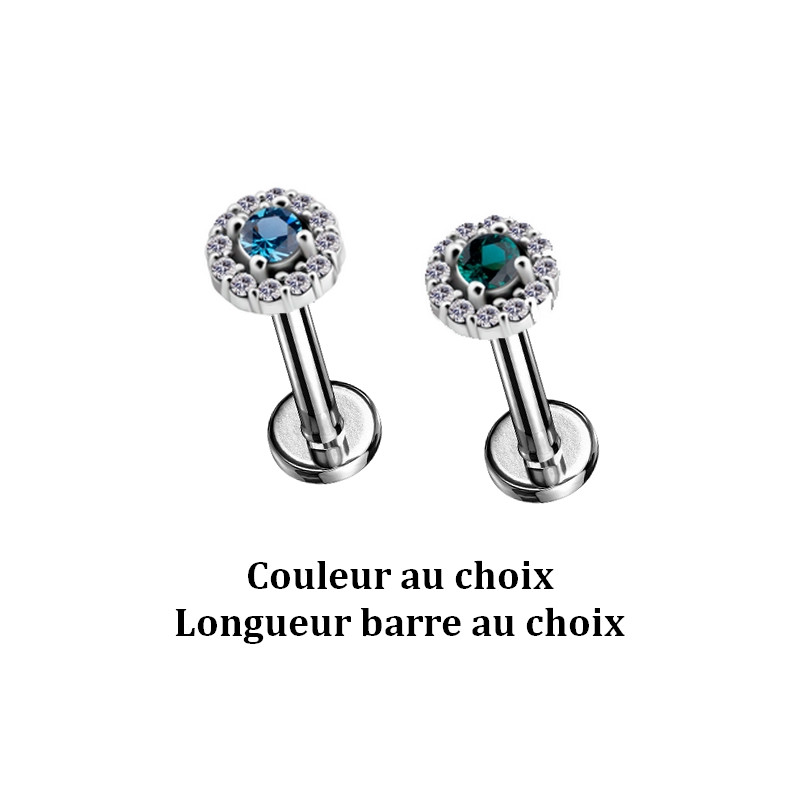 Bijou pour le labret ou l'oreille (lobe, cartilage - hélix, tragus, conch, flat...) en Titane ASTM F-136 (grade 23), avec motif fleur avec strass blancs autour brillant, en Cobalt Chrome sans nickel (COCR NF) et strass premium cubic zirconia.