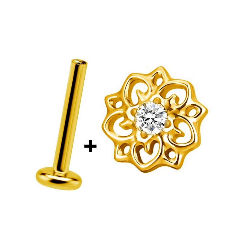 Bijou pour le labret, la lèvre ou l'oreille (lobe, hélix, tragus, conch, snug) en Titane ASTM F-136 (grade 23) doré or fin, avec motif fleur ethnique avec 1 brillant blanc serti au centre. Embout à visser vis interne 0,8 mm, dans la barre labret. Taille : 6,6 mm.