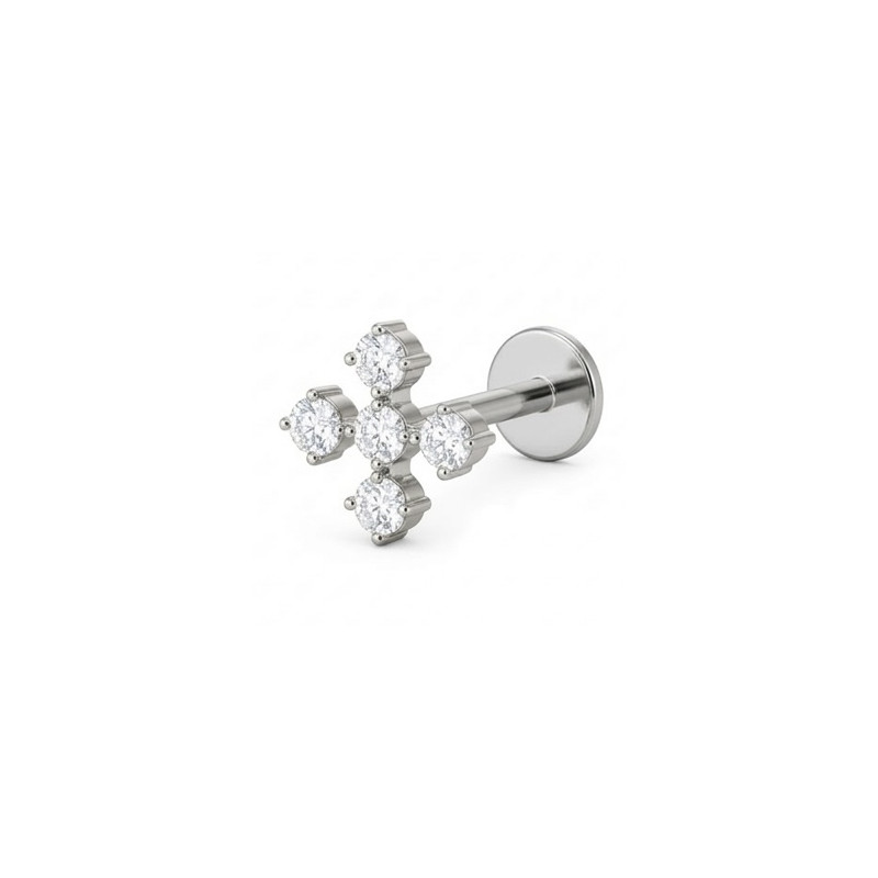 Bijou pour le labret, la lèvre ou l'oreille (lobe, hélix, tragus, conch, snug) en Titane ASTM F-136 (grade 23), avec un motif croix avec 5 strass blancs sertis.
