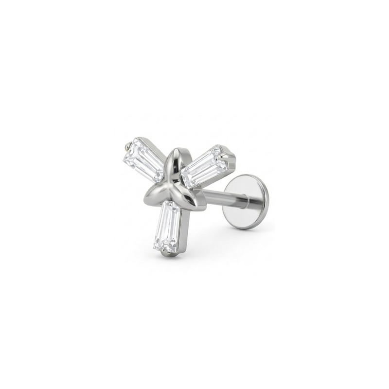 Bijou pour le labret, la lèvre ou l'oreille (lobe, hélix, tragus, conch, snug) en Titane ASTM F-136 (grade 23), avec un motif fleur avec 3 strass blancs sertis.
