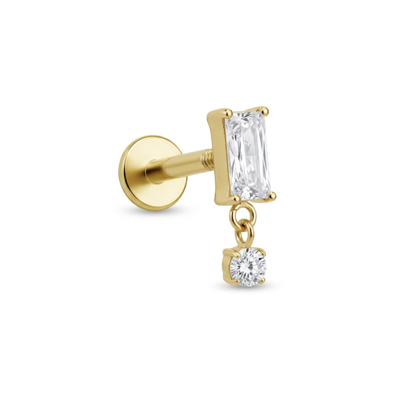 Bijou pour le labret, la lèvre ou l'oreille (lobe, hélix, tragus, conch, snug) en Titane doré or finASTM F-136 (grade 23), avec un motif strass rectangulaire et strass rond pendant blancs sertis.