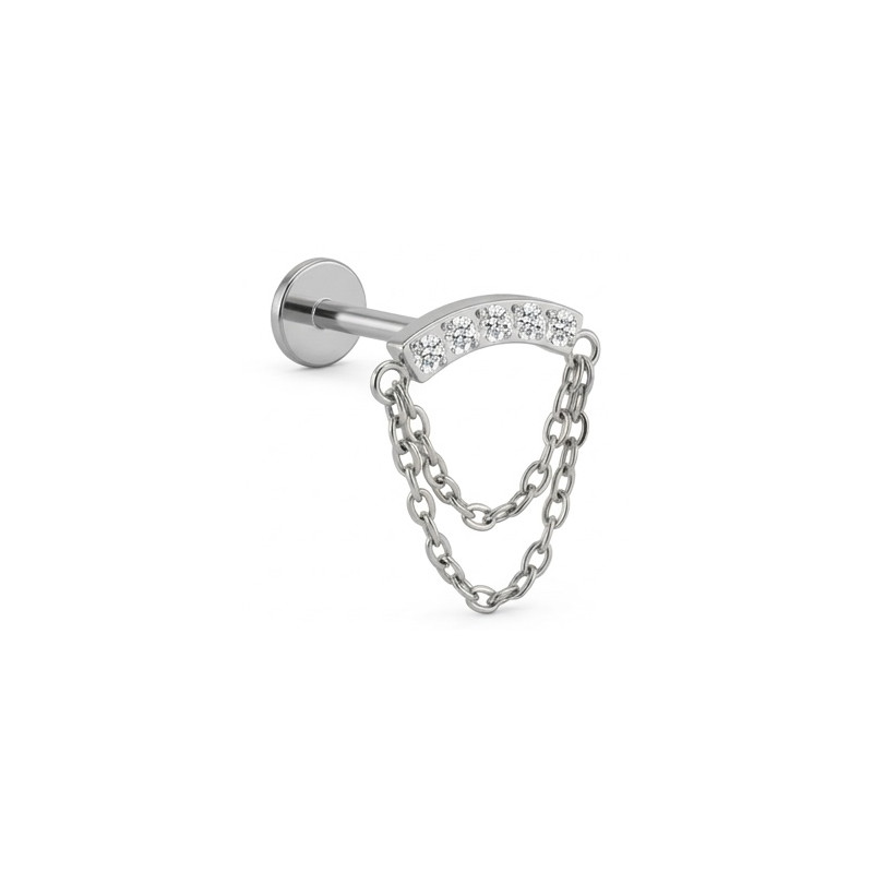 Bijou pour le labret ou l'oreille (lobe, cartilage - hélix, tragus) en Titane ASTM F-136 (grade 23), avec 5 strass blancs en long sertis, avec une chainette. Embout à visser vis interne 0,8 mm, dans la barre labret.