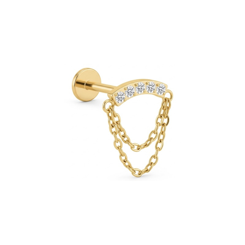 Bijou pour le labret ou l'oreille (lobe, cartilage - hélix, tragus) en Titane doré or fin ASTM F-136 (grade 23), avec 5 strass blancs en long sertis, avec une chainette. Embout à visser vis interne 0,8 mm, dans la barre labret.