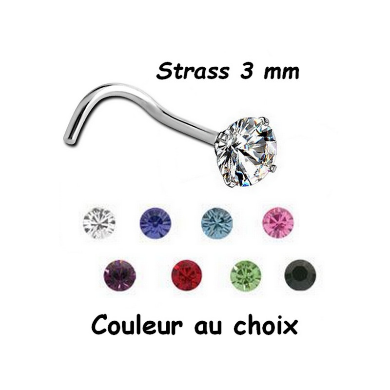 Bijou de piercing pour le nez plat avec brillant serti 4 griffes et tige en tire-bouchon, en acier chirurgical. Epaisseur tige 0,8 mm. Taille strass 3 mm.