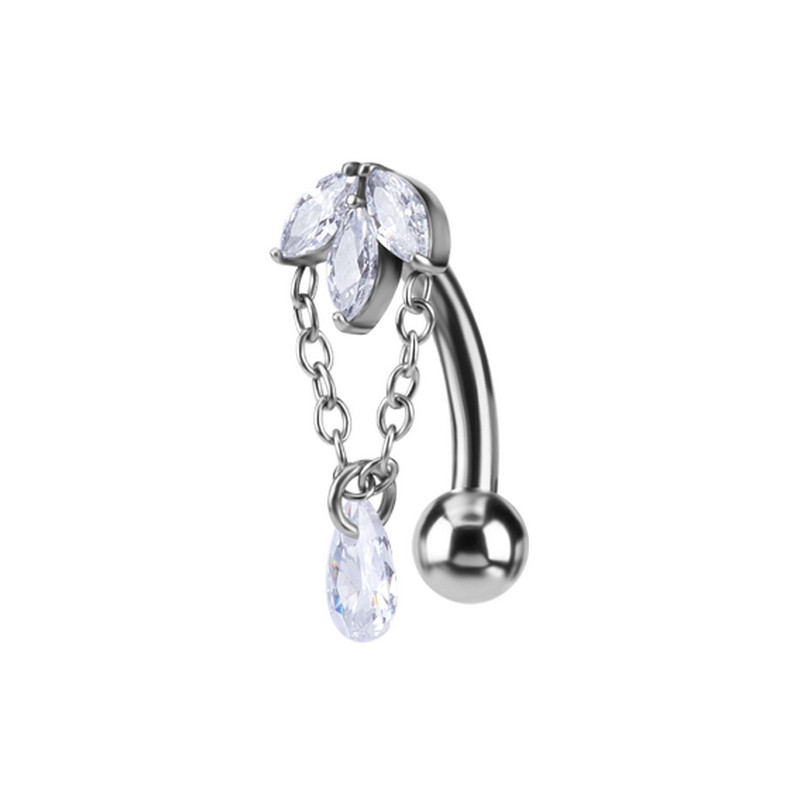 Bijou de piercing pour le nombril en acier chirurgical 316L inversé, avec motif marquise 3 brillants blancs cubic zirconia sertis avec pendant chaine et strass ovale.