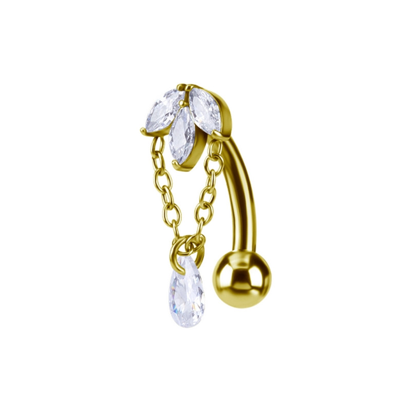 Bijou de piercing pour le nombril en acier chirurgical 316L doré or fin, inversé avec motif marquise 3 brillants blancs cubic zirconia sertis avec pendant chaine et strass ovale.