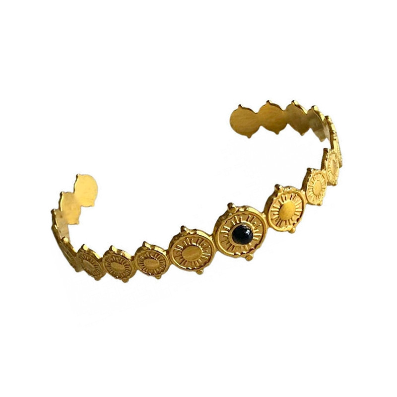 Bracelet jonc, pour femme, en acier chirurgical doré, réglable, avec motifs ethnique et pierre onyx synthétique.