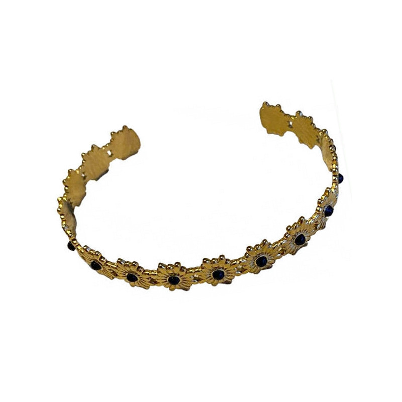 Bracelet jonc, pour femme, en acier chirurgical doré, réglable, avec motifs 16 fleurs avec pierres onyx synthétiques.