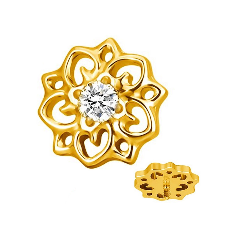 Embout pas de vis interne 0,8 mm à visser dans barre 1,2 mm, en Titane ASTM F-136 (grade 23), avec un motif fleur ethnique avec 1 brillant blanc serti au centre.